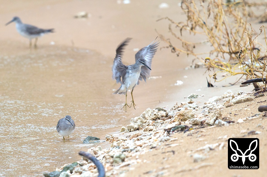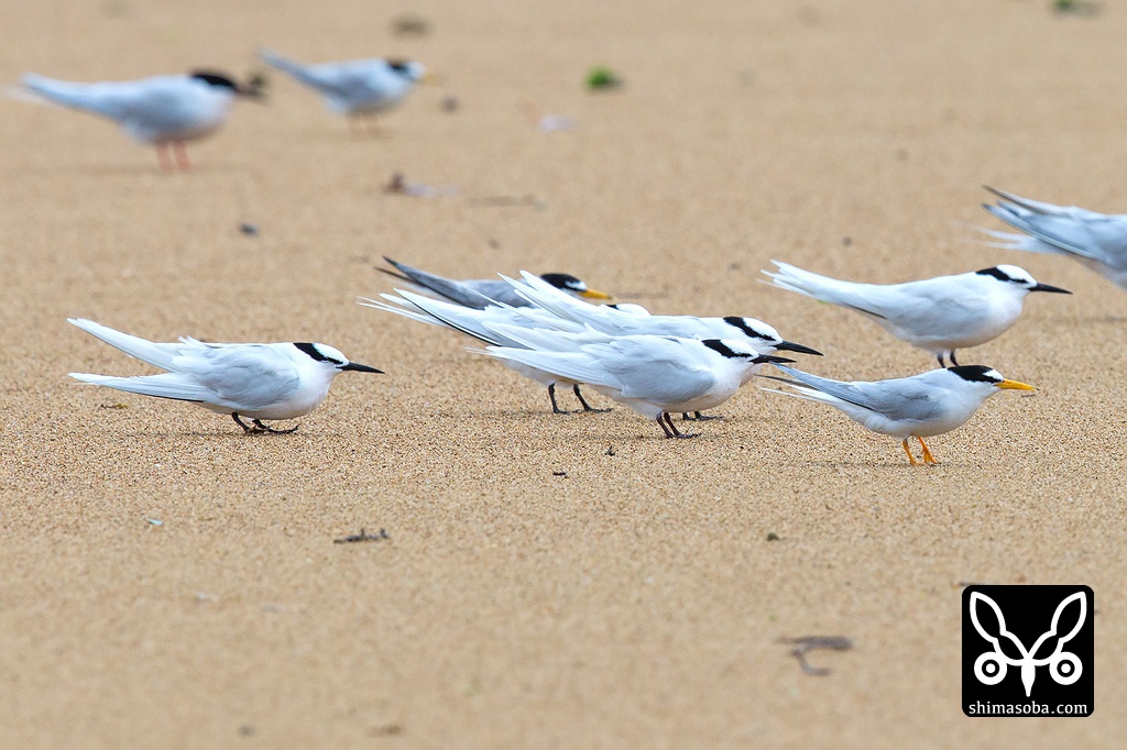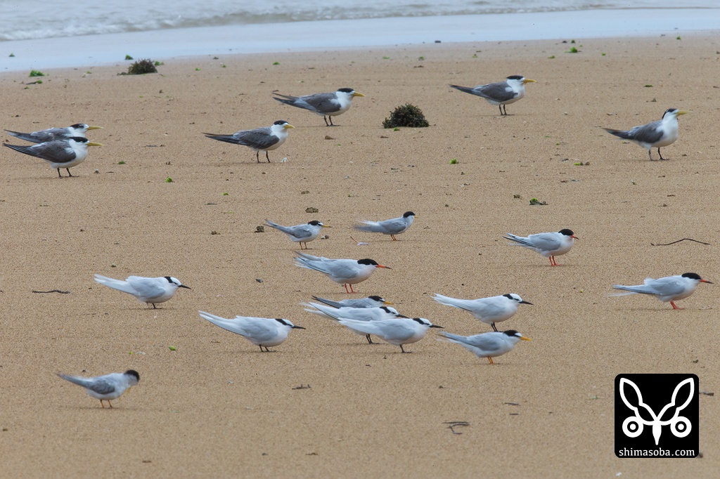 台風の暴風を避けて、アジサシの仲間やシギ、チドリが風裏になる大浜海岸から宮良川河口付近に集まっていました。