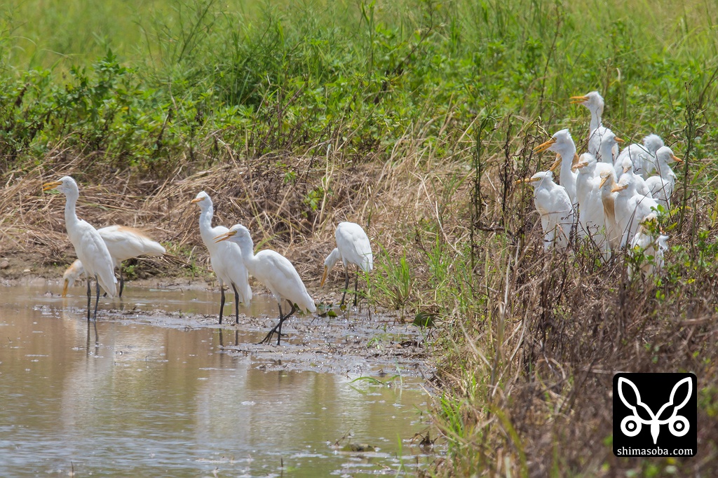 アマサギも暑いようで口を開けています。陽炎もたっていて写真がぼやけます…。^^;