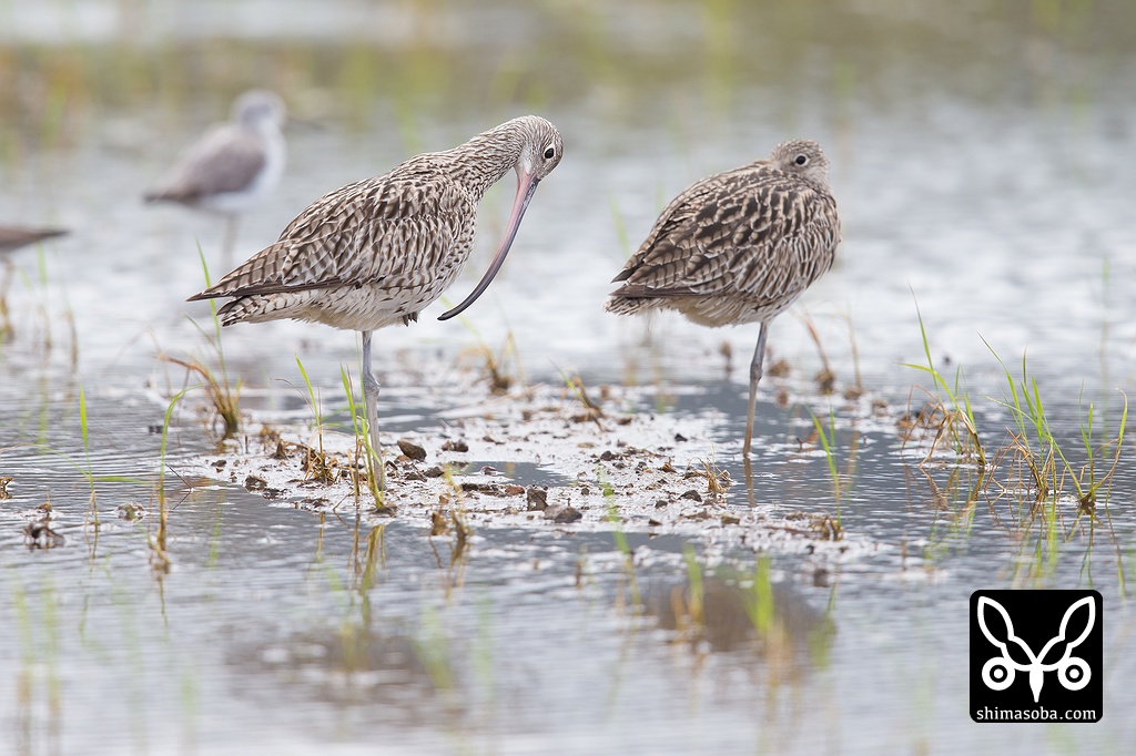 ホウロクシギ3羽とチュウシャクシギ2羽が名蔵湾に飛来していました。師匠によるとダイシャクシギもいたそうですが、私は見つけられず…。^^; ホウロクシギの1羽は左足を傷めていて、 先日、田んぼで見つけた個体 と同じと思われます。