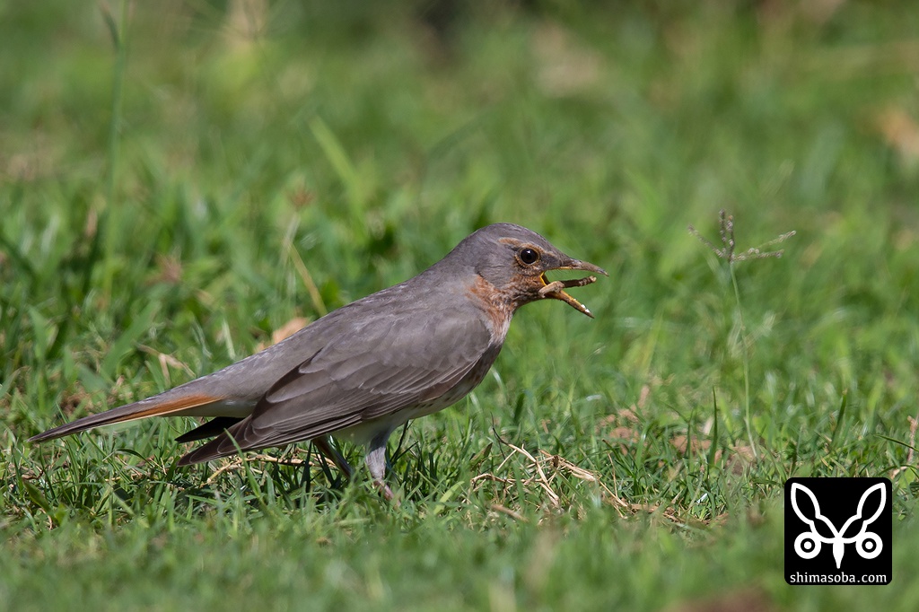 シャクトリムシのようなものを捕まえたノドアカツグミ。