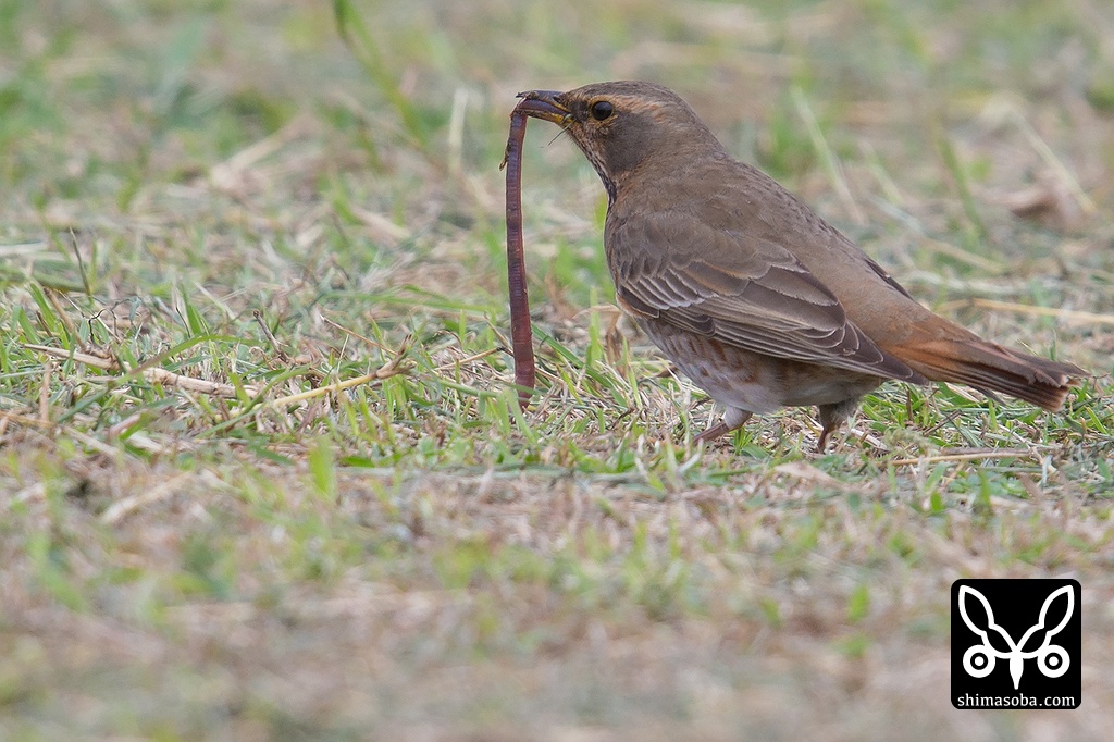 芝生を掘り返してミミズを捕まえたハチジョウツグミ。見事なものです。