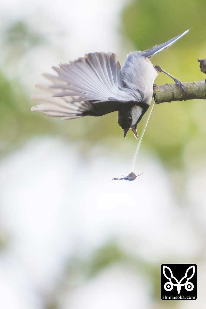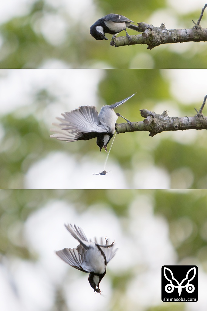 枝先にクモを見つけるが、クモがジャンプ!! すかさず追いかけたシジュウカラは首尾よくクモを捕まえました。^^