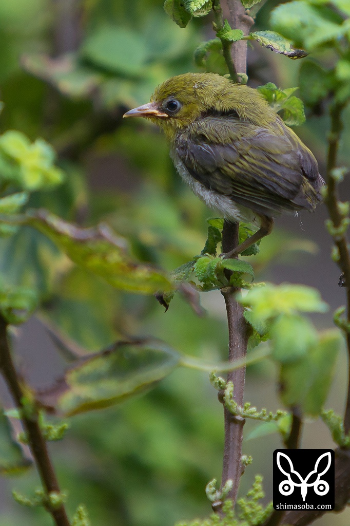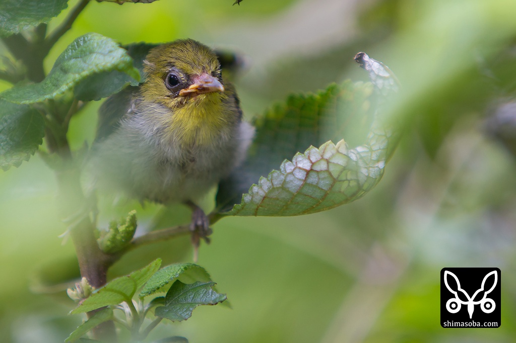 葉っぱの長さは4センチほど。メジロの巣立ち雛は小さくて色合いも緑なので少し目を離すと見失います。
