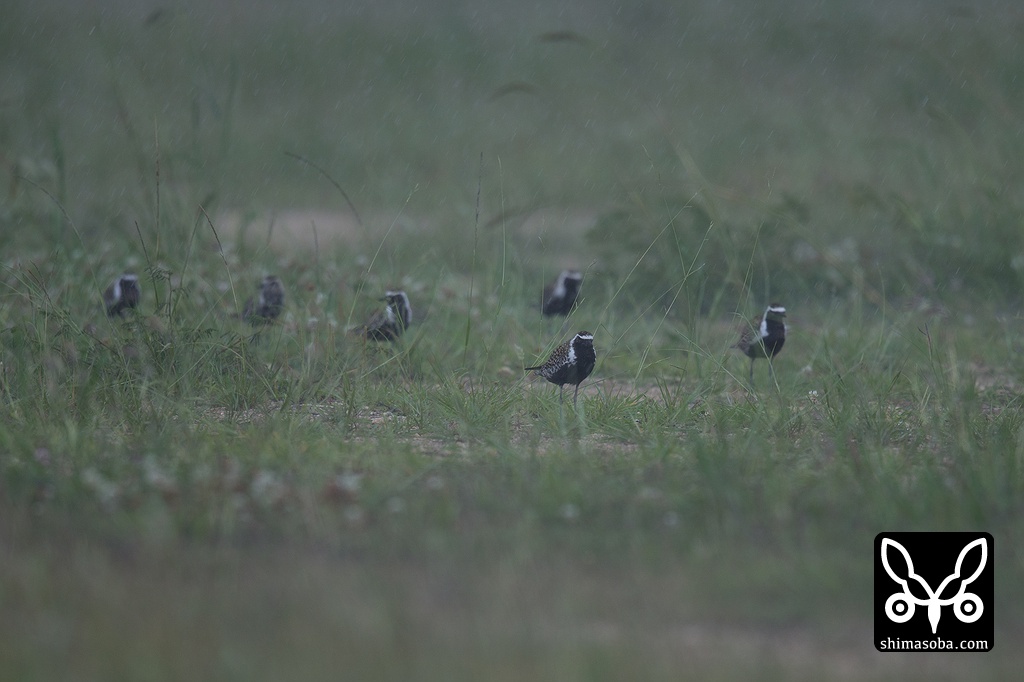 午後3時ごろから大雨と暴風が吹きましたが、荒れ地のムナグロ100羽はじっと耐えていました。雨が上がるとどこかへ飛び去りました。