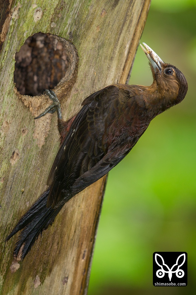 ヒナのフンを持って出てきたノグチゲラのメス。