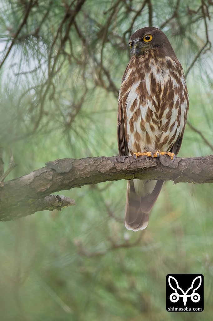ヘソ出しスタイルで巣を見張るアオバズクのオス。リラックスしていますが私の動向はしっかり見ています。