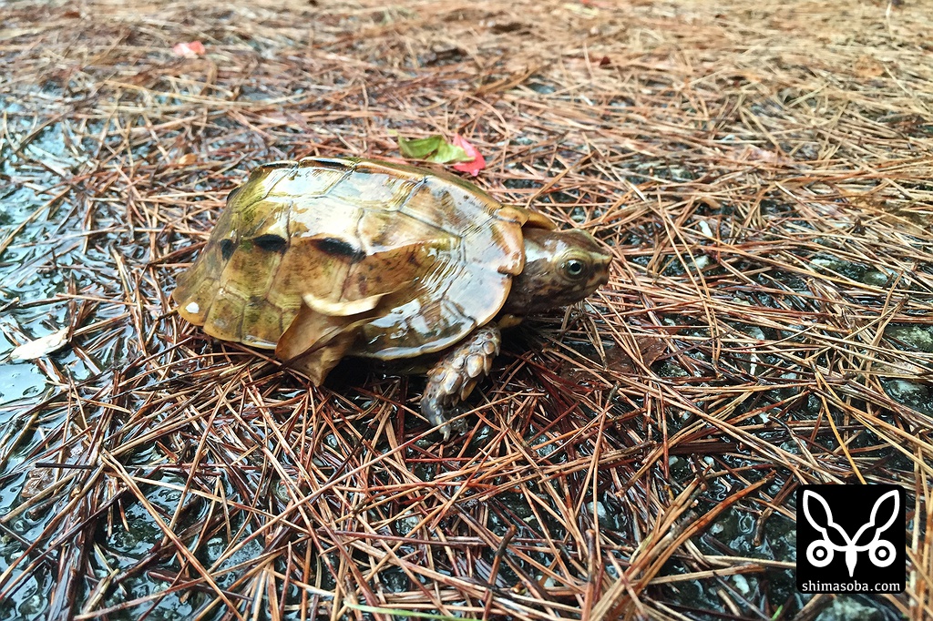 雨の降る林道には、国の天然記念物のリュウキュウヤマガメが現れました。