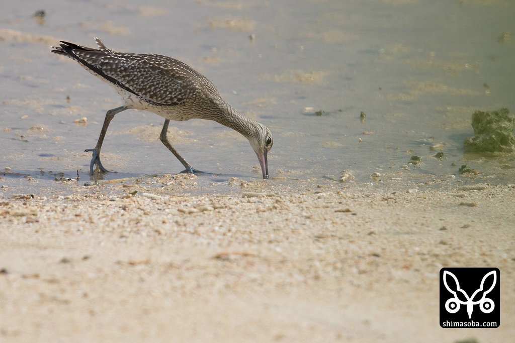 チュウシャクシギは波打ち際を歩きながら、カニの巣を見つけては長いくちばしを差し込みカニを探していました。