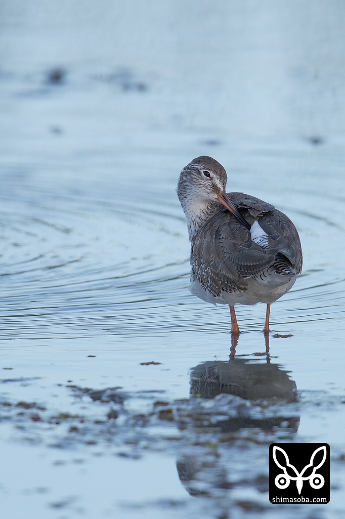 サルハマシギと同じ田んぼにアカアシシギ成鳥が1羽。ほぼ冬羽。