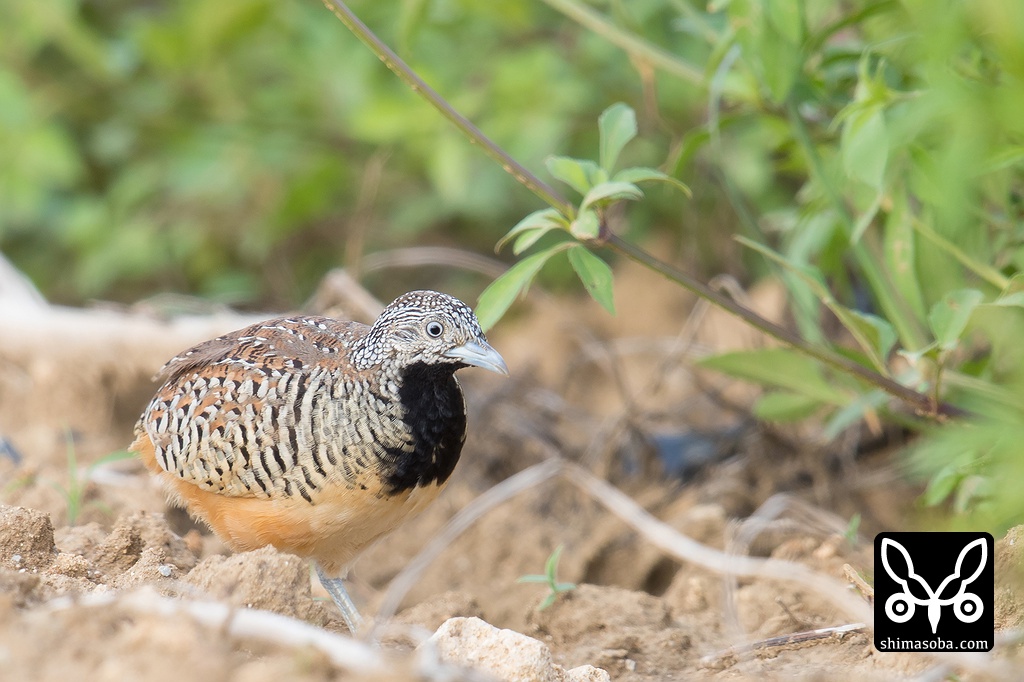 オスのミフウズラ。トコトコと向こうへ歩いて行くところだったので、鳥を立ち止まらせ、なおかつこちらを向かせる必殺技を使いました。^^ 大体の種類の鳥はこれで一瞬フリーズしてこちらを向いてくれますが、同じ個体に二度目は通用しません。^^;