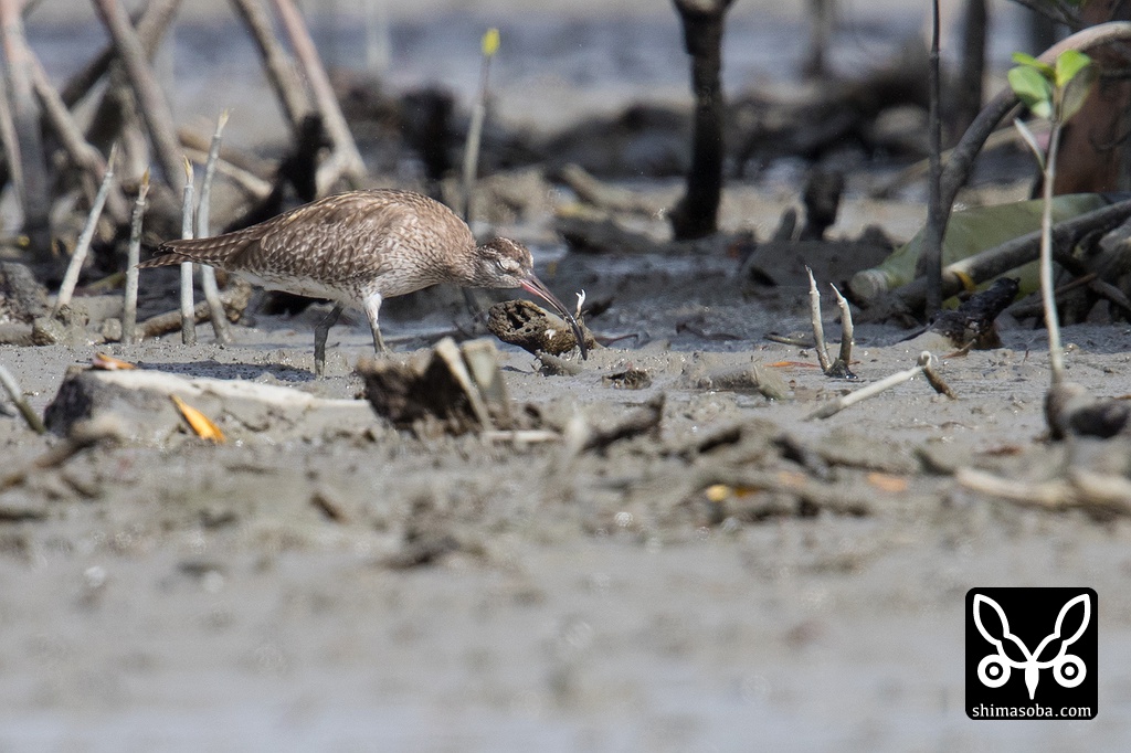 チュウシャクシギとアカアシシギが数十羽ずついました。漫湖に大量に生息しているヒメヤマトオサガニはシギたちの餌になっているようです。