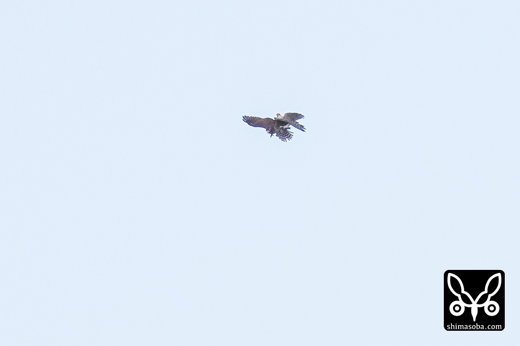 ツミに襲撃されるサシバ。ツミがサシバの尾羽に噛みついています。