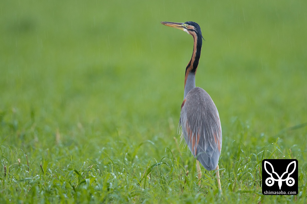 ズグロミゾゴイは、幼鳥が雨に濡れながらの餌探し。