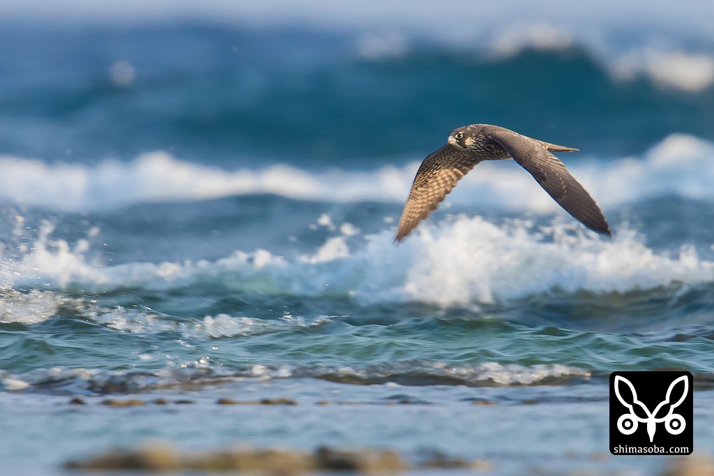波間を飛ぶハヤブサ。カモでも襲うのかと思いましたが、その気は無いようだ。