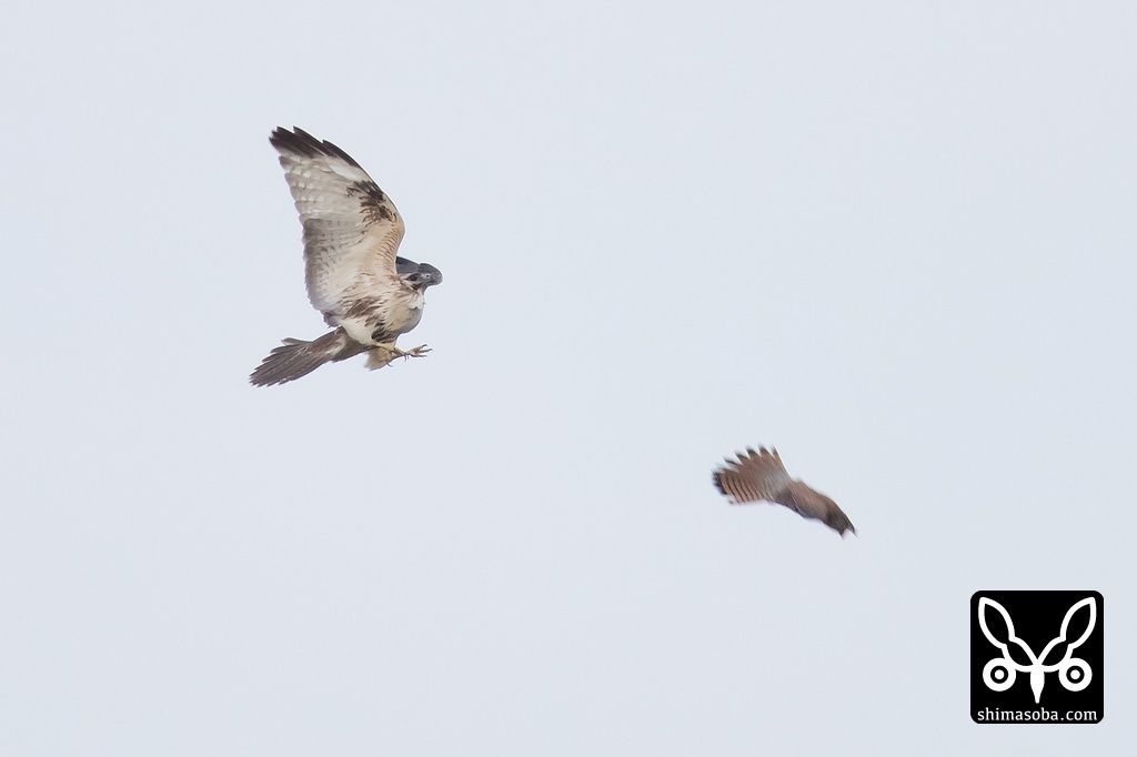 ギリギリで急ブレーキしながら首をすくめチョウゲンボウの攻撃をかわすノスリ。