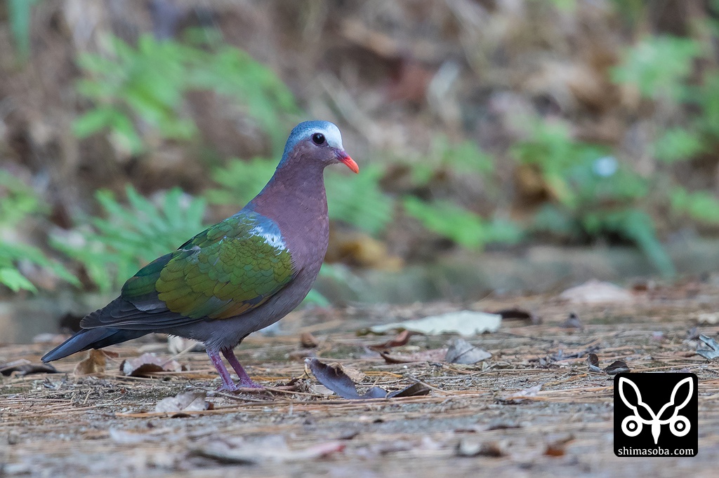 地面で採餌するキンバトのオス。上のメスと同じ場所で餌を拾っていた。