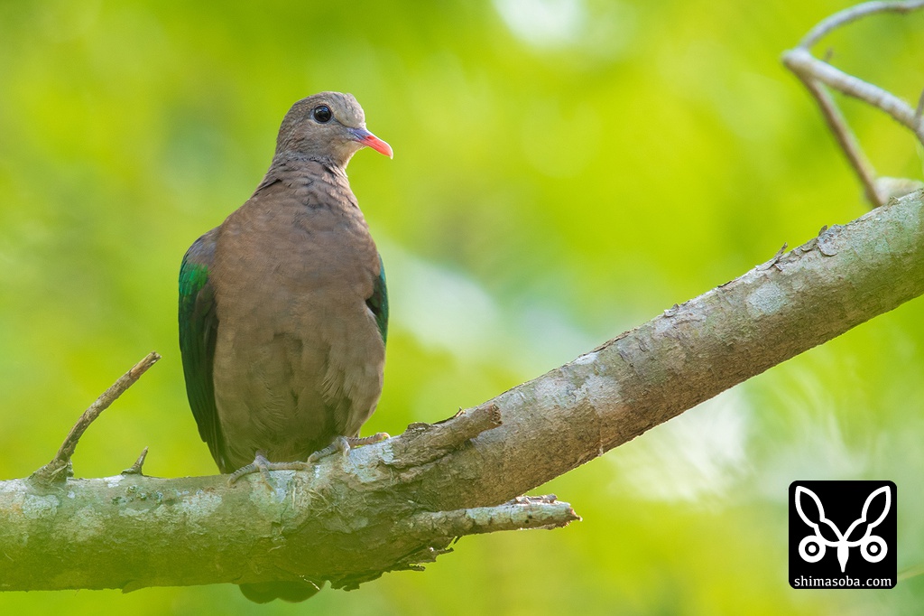 リュウキュウマツに止まるキンバトのメス。横からの光が後ろの葉を美しく緑に染め、まるで新緑のようだった。