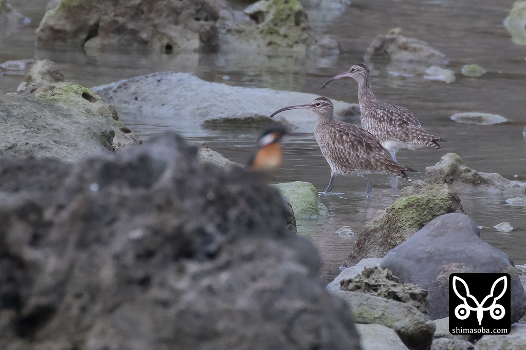 海岸にはチュウシャクシギが5羽。手前にぼんやり映るのはカワセミ。