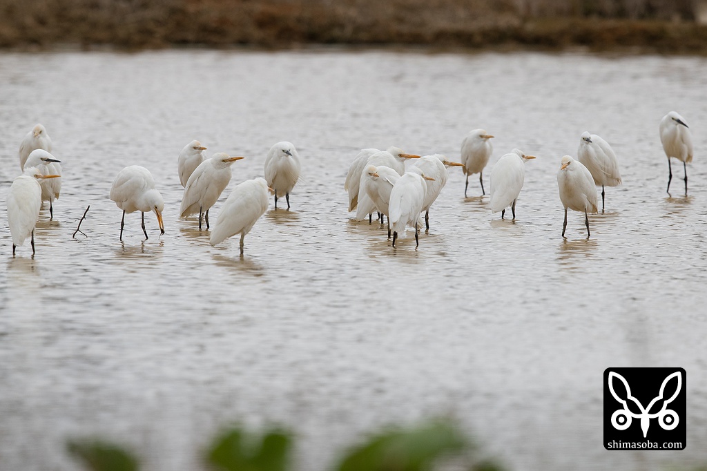 水路には、ヒバリシギが20羽ほどとタシギ。沖縄本島では少ないシロハラクイナも出てきましたが、警戒心が強い。^^; 水の張られた田んぼにはコサギとアマサギ合わせて50羽ほどの混群。