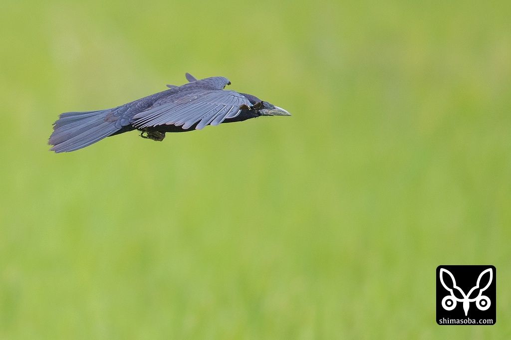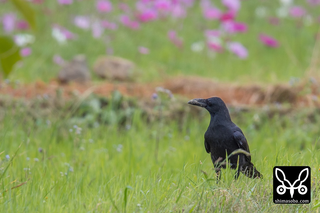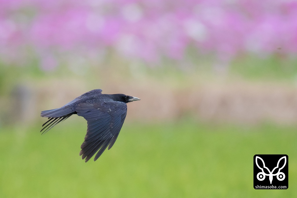 コスモスをバックに飛ぶミヤマガラス。沖縄本島では、コスモスを緑肥にするようで、あちこちの田んぼにコスモスが植えられています。まもなく、コスモス祭りも行われるようです。