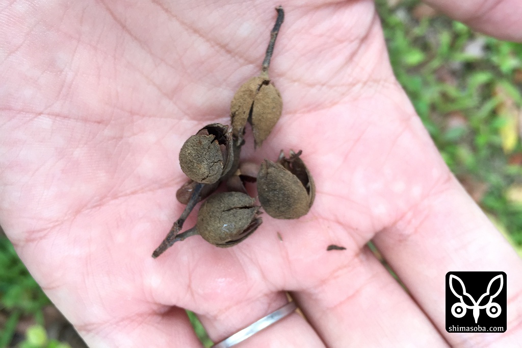 アトリが食っていたイスノキの実。2裂して中から黒い種がのぞいていた。