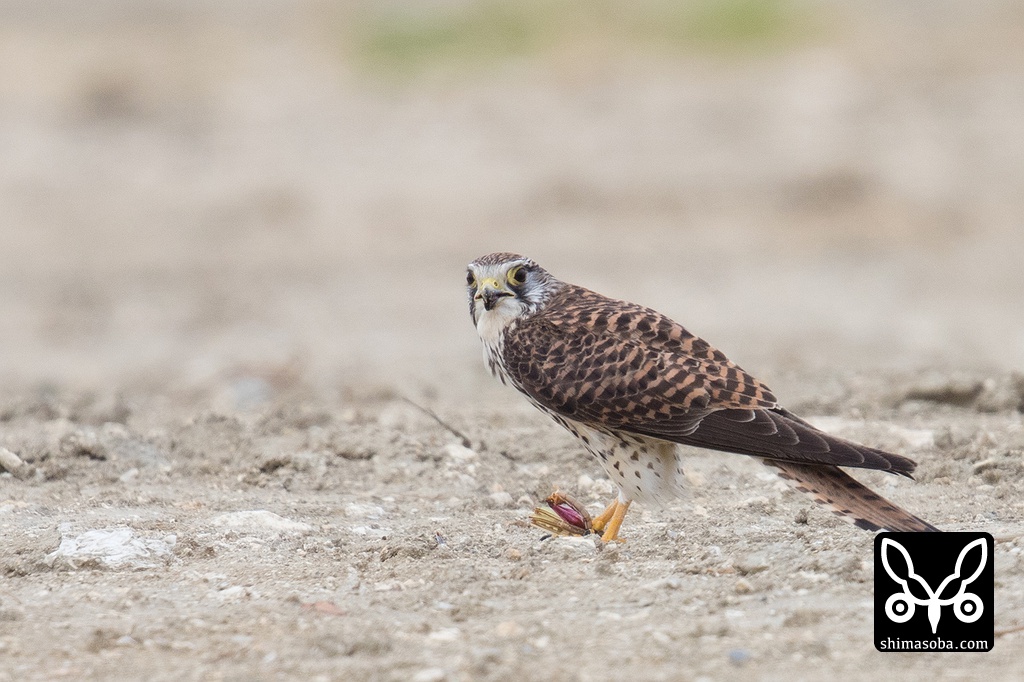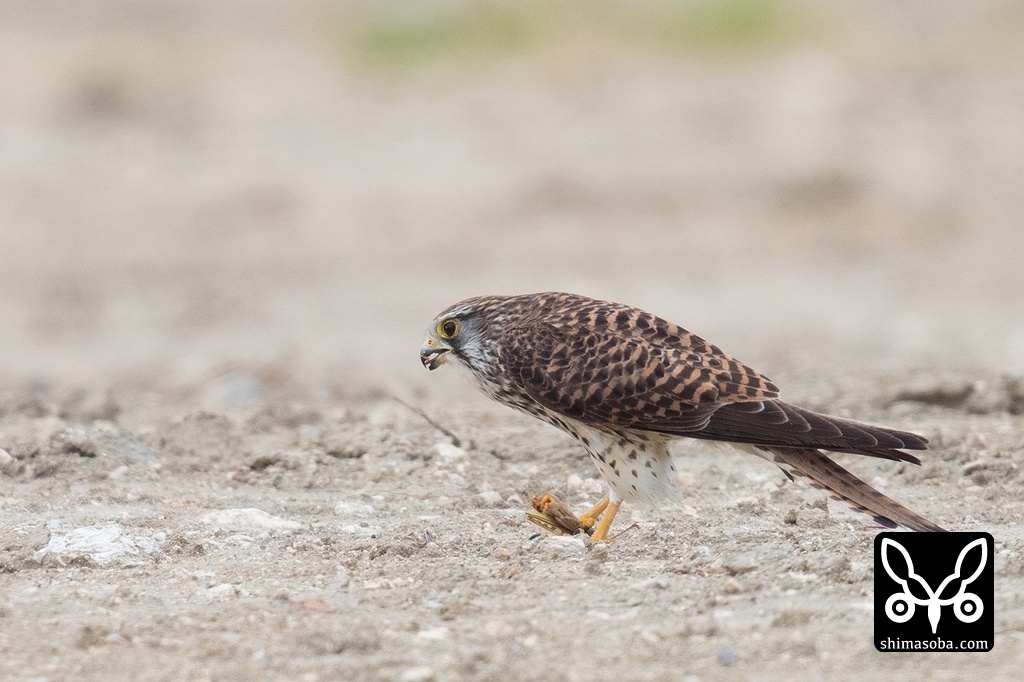 大きなタイワンツチイナゴを捕まえたチョウゲンボウのメス成鳥。以下、同じ個体。