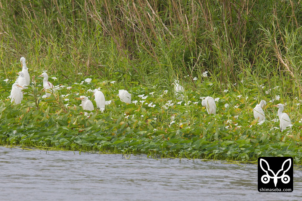 北寄りの強風が吹きつけていたので、いつもにねぐらの木じゃなく水草の上にアマサギたちも避難です。