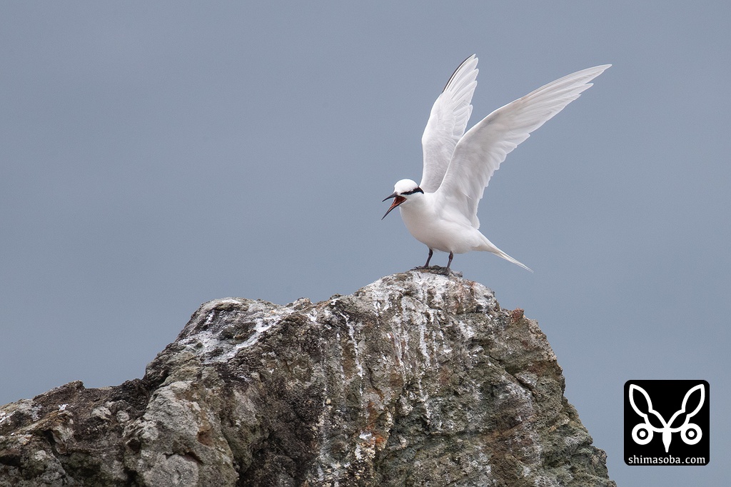 岩礁のてっぺんに止まっては、翼を広げ鳴き声をあげていた。
