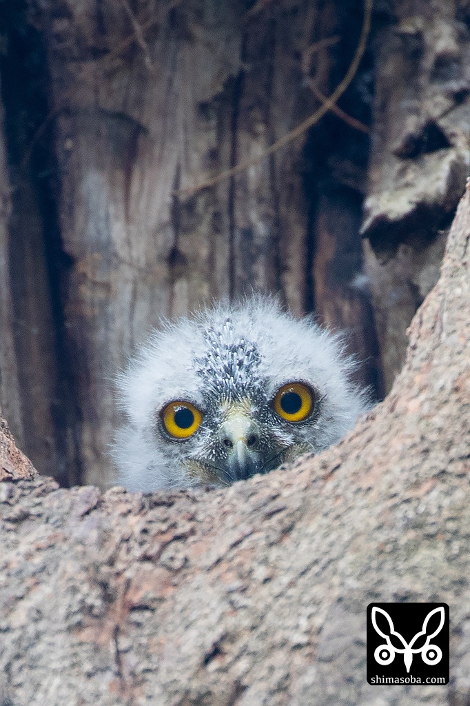 昼間、巣穴から顔をのぞかせたアオバズクのヒナ。まだまだ綿毛が残ります。