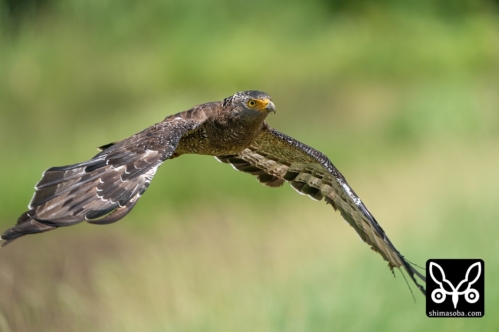 カンムリワシの飛翔。しっかり目にピントが来ています。