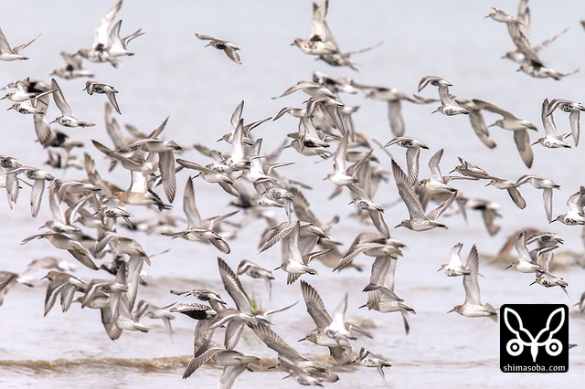 たくさん休むシギチの群れの中にヘラシギが1羽だけいました。双眼鏡で探しまくってやっと見つけられました。^^ 自宅に帰ってから調べると、ヘラシギは3日前の9月12日に初認されたそうです。いいタイミングでした。^^ かなり遠いので超トリミング。^^;
