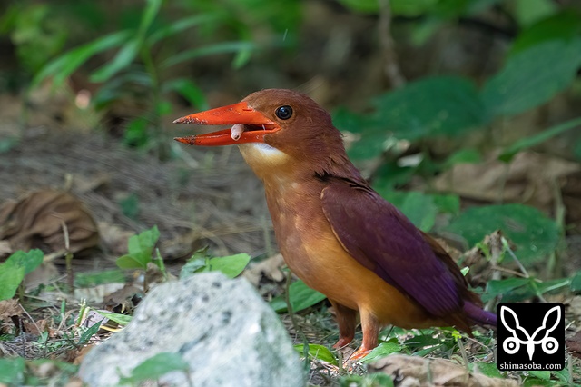 地上でミミズを捕まえたリュウキュウアカショウビンのメス。