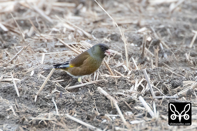 カワラヒワもスズメの大群と同じ田んぼに。こちらはスズメの群れとは合流しないようだ。