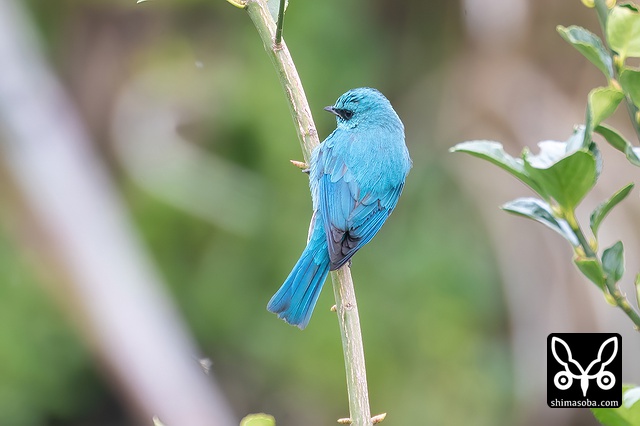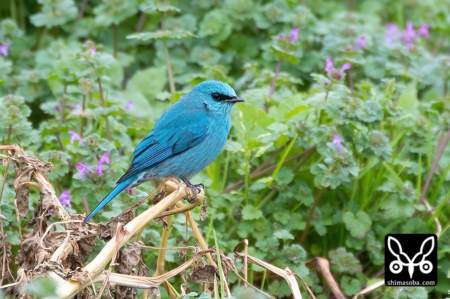 畑の植栽に止まるロクショウヒタキのオス。