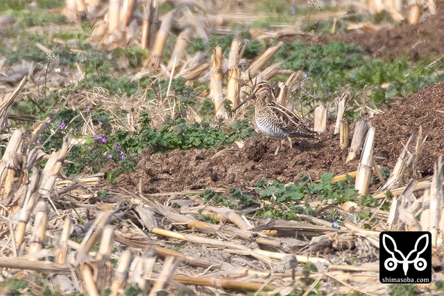 タシギが4羽。堆肥の中に潜む虫を探している模様。