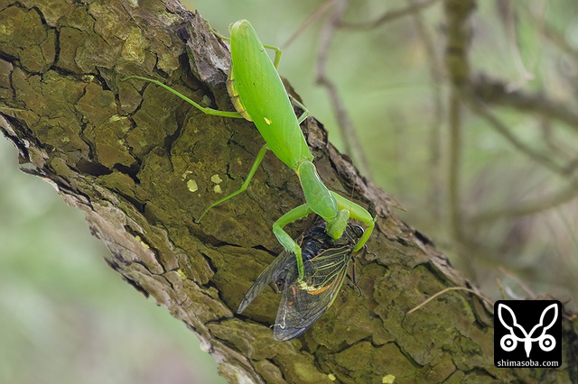 アオバズクの巣の近くではハラビロカマキリがクマゼミを襲っていた。断末魔があたりに響き渡っていました。