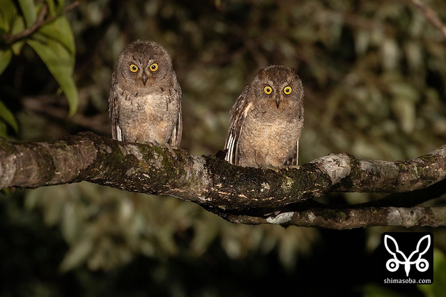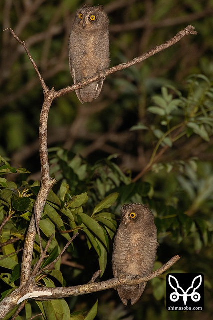 親子で並んだアオバズク。左が巣立ったヒナで右がオス親。