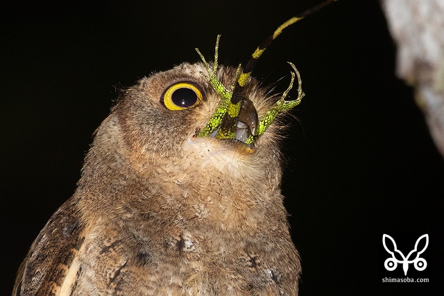 オオコノハズクの餌場に行ってみるといつもの個体がゴキブリやセミの幼虫をとっていた。コノハズクやアオバズクより一足早く子育てが終わってるオオコノハズクは、すでに目の周りから換羽が始まっています。