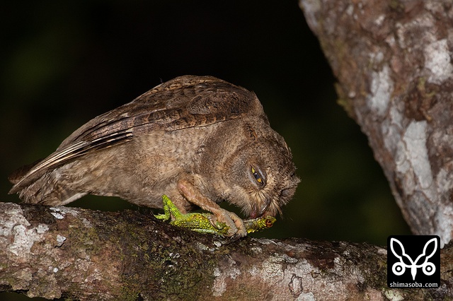 コノハズクの全長と変わらない大きさのキノボリトカゲだったので呑み込むのに苦労していた。