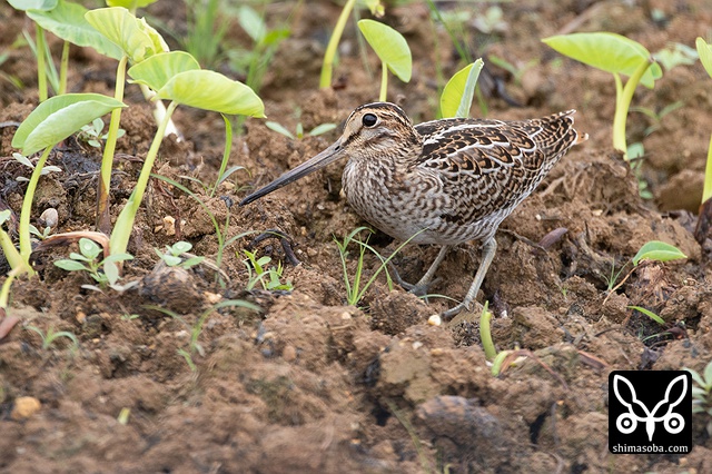 あぜ道にチュウジシギ。なぜか耳の穴まで見える。