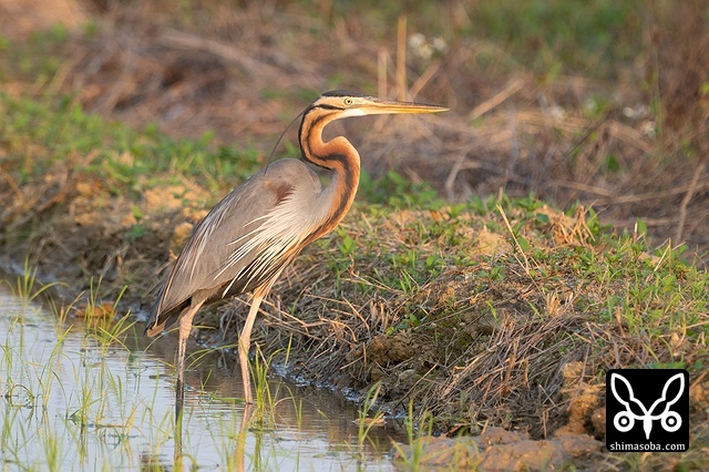 上のリュウキュウヨシゴイの目の前に現れたムラサキサギ。