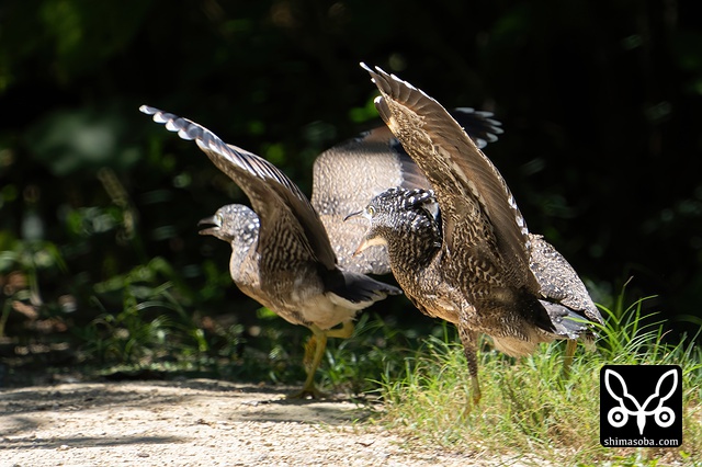 親からエサをもらい奪い合う2羽のズグロミゾゴイの幼鳥。