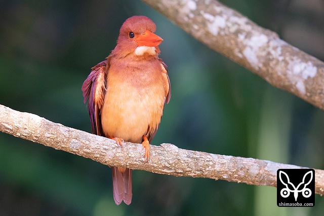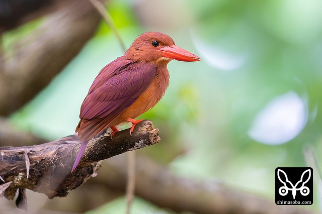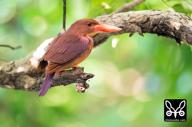 アカショウビンのメスと思われる個体。目先や目の後ろなどに白い羽が混じる個体です。