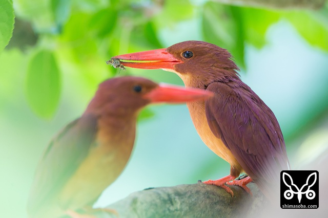 左の下の嘴が欠けた方がオス、右がメス。セミの幼虫をもらっているようでした。このペアは交尾も巣穴掘りも済ませているのに求愛給餌をする模様です。^^