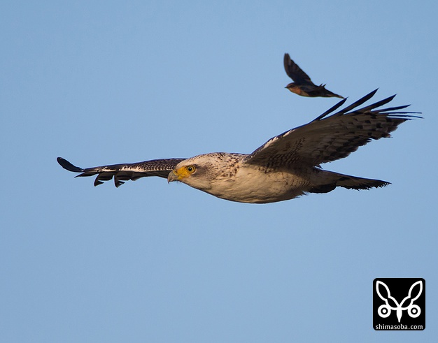 数十メートル先のカニを見つけて襲いかかるカンムリワシ幼鳥にアタックするツバメ。