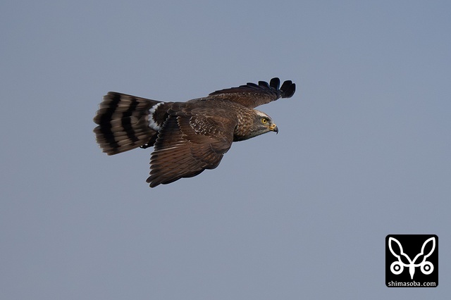 やっと飛び立ったカンムリワシ。右の翼には少し事故の影響が残っているようで、左の翼に比べると前へ出ないようでしたが飛翔には問題なさそうでした。
