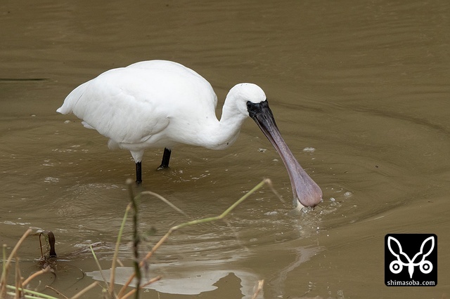 ヘラサギは1羽だけがクロツラヘラサギの群れに交じっていました。