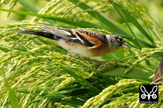 米を食うアトリのオス。夏羽から冬羽へ移行中です。