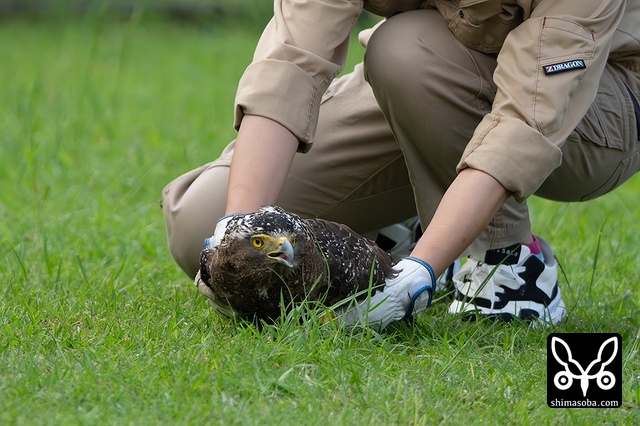 リハビリ施設がある石垣やいま村の担当者により放鳥されるカンムリワシ。