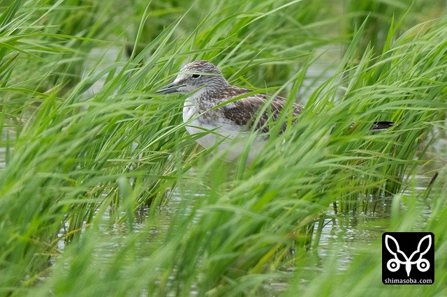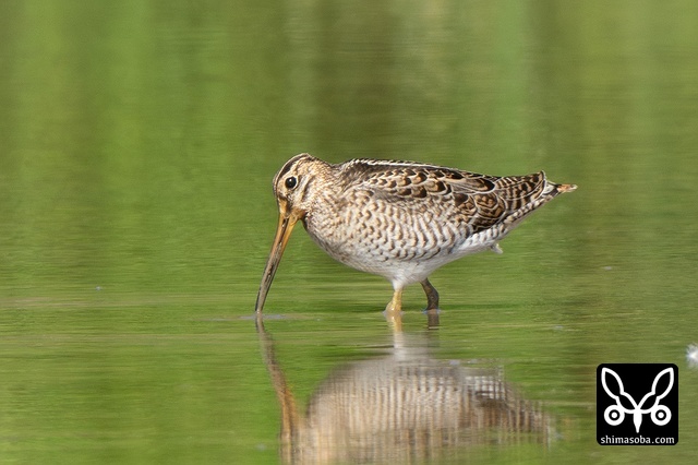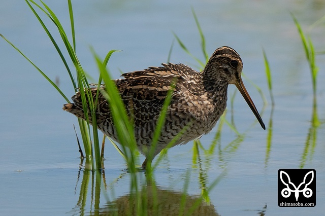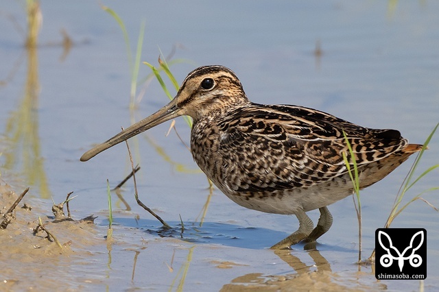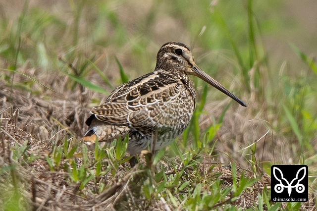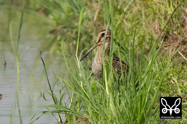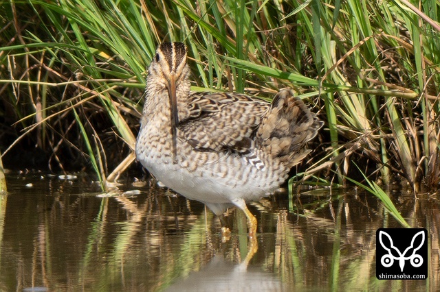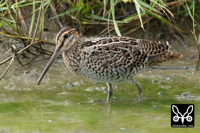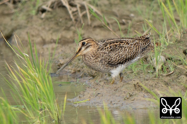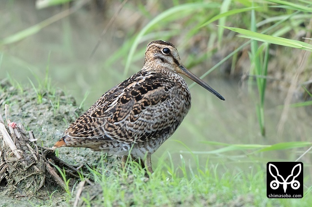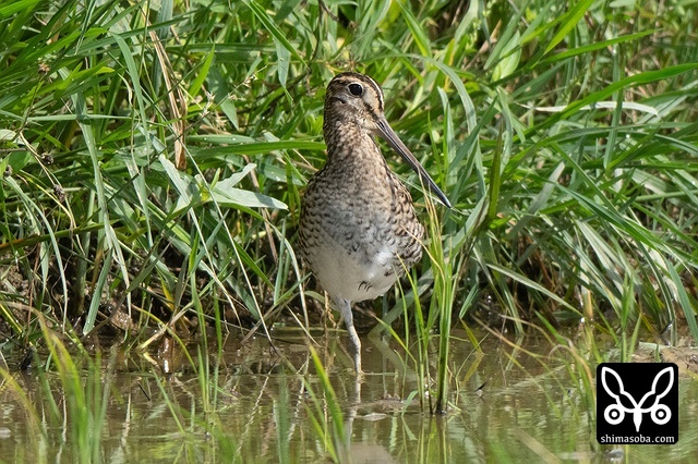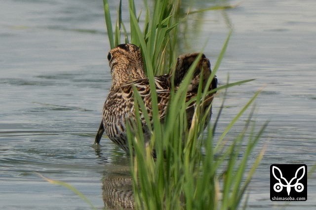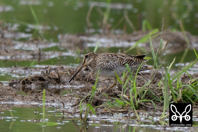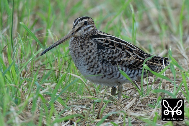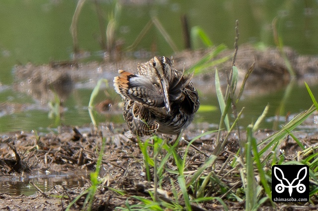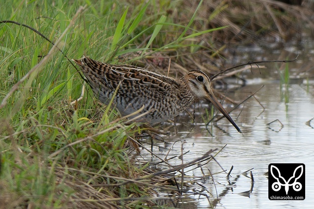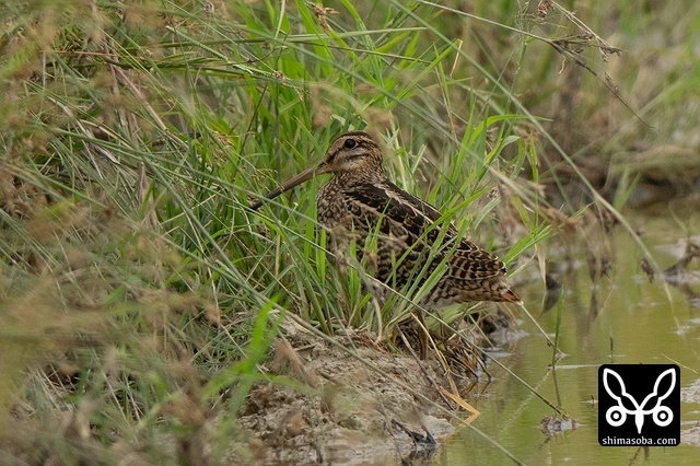 数十羽のジシギを見続けて、やっと絞り出したハリオシギ。チュウジシギ10羽程度の群れを見ていると草むらの中にジシギが登場。典型的なハリオシギの幼鳥でしたので尾羽をゲットすべく双眼鏡で追っていると意外と早く水浴びをしてくれました。^^